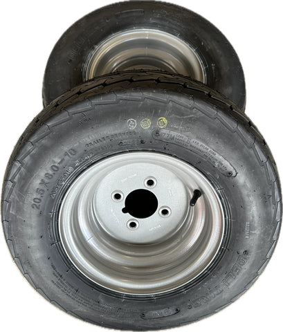 A pair of: 20.5x8.0-10 77M Deli fitted onto a 4 Stud, 4" PCD, 67mm Centre, ET-3 wheels
